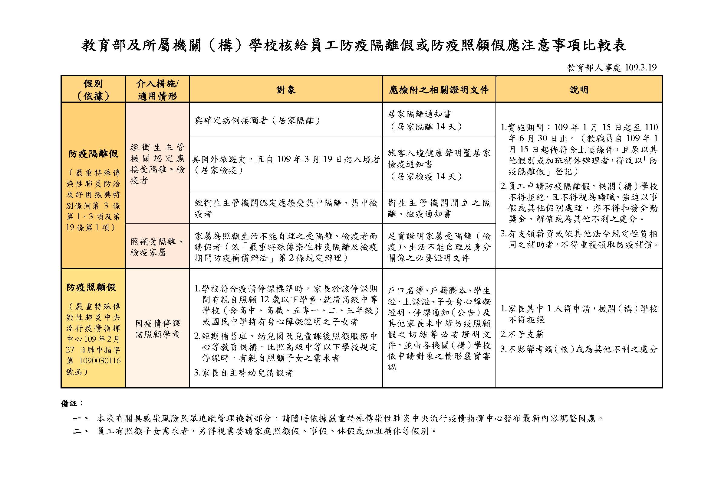 教育部及所屬機關(構)學校核給員工防疫隔離假或防疫照顧假應注意事項比較表(1090319)