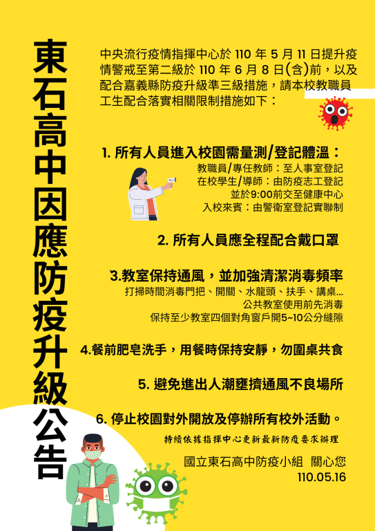 國立東石高中因應新型冠狀肺炎疫情升級處理措施1100516