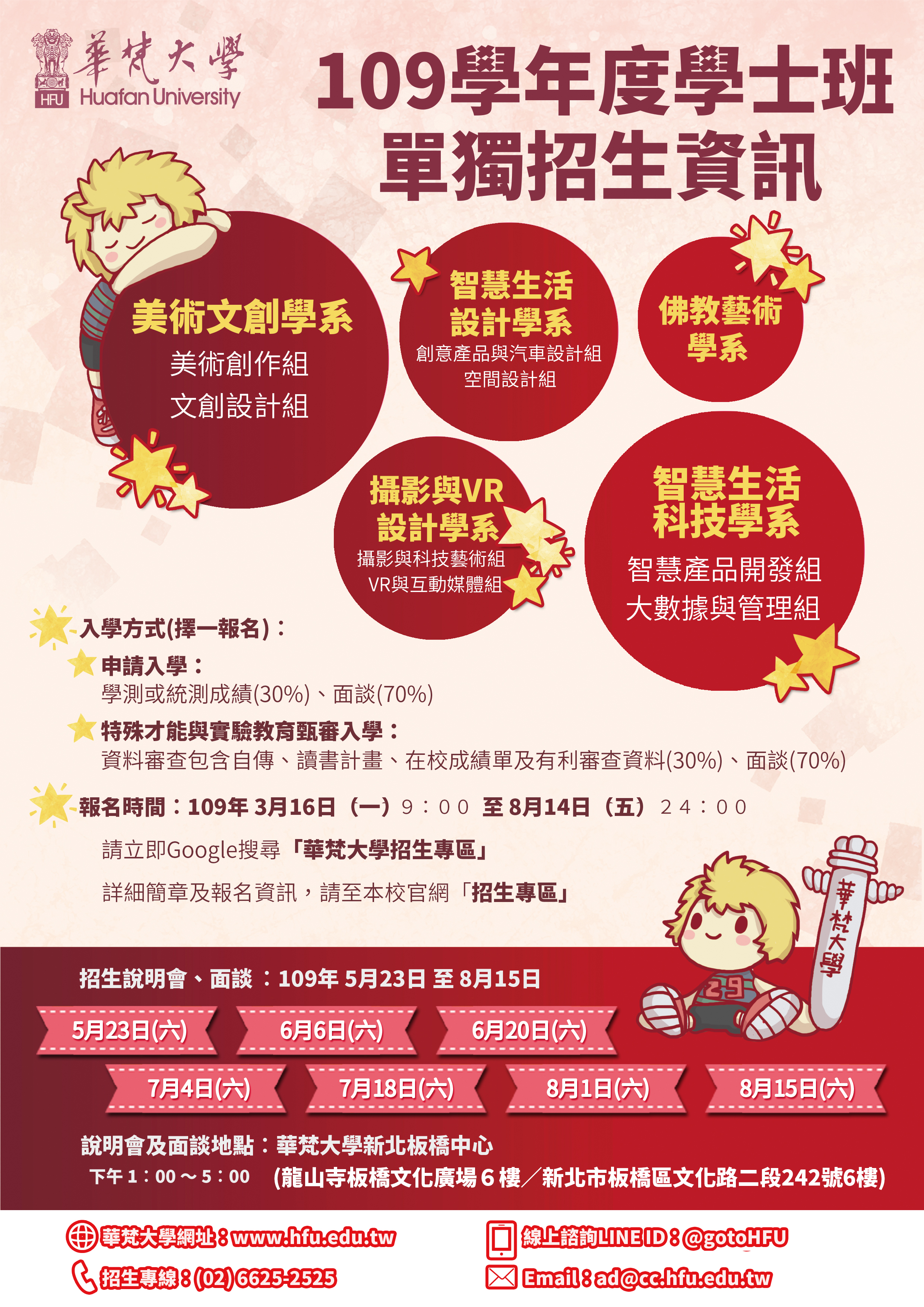 三、學士班單獨招生入學管道自即日起報名至109年8月14日止,詳情請至華梵大學官網「招生專區」報名與查詢相關資訊。