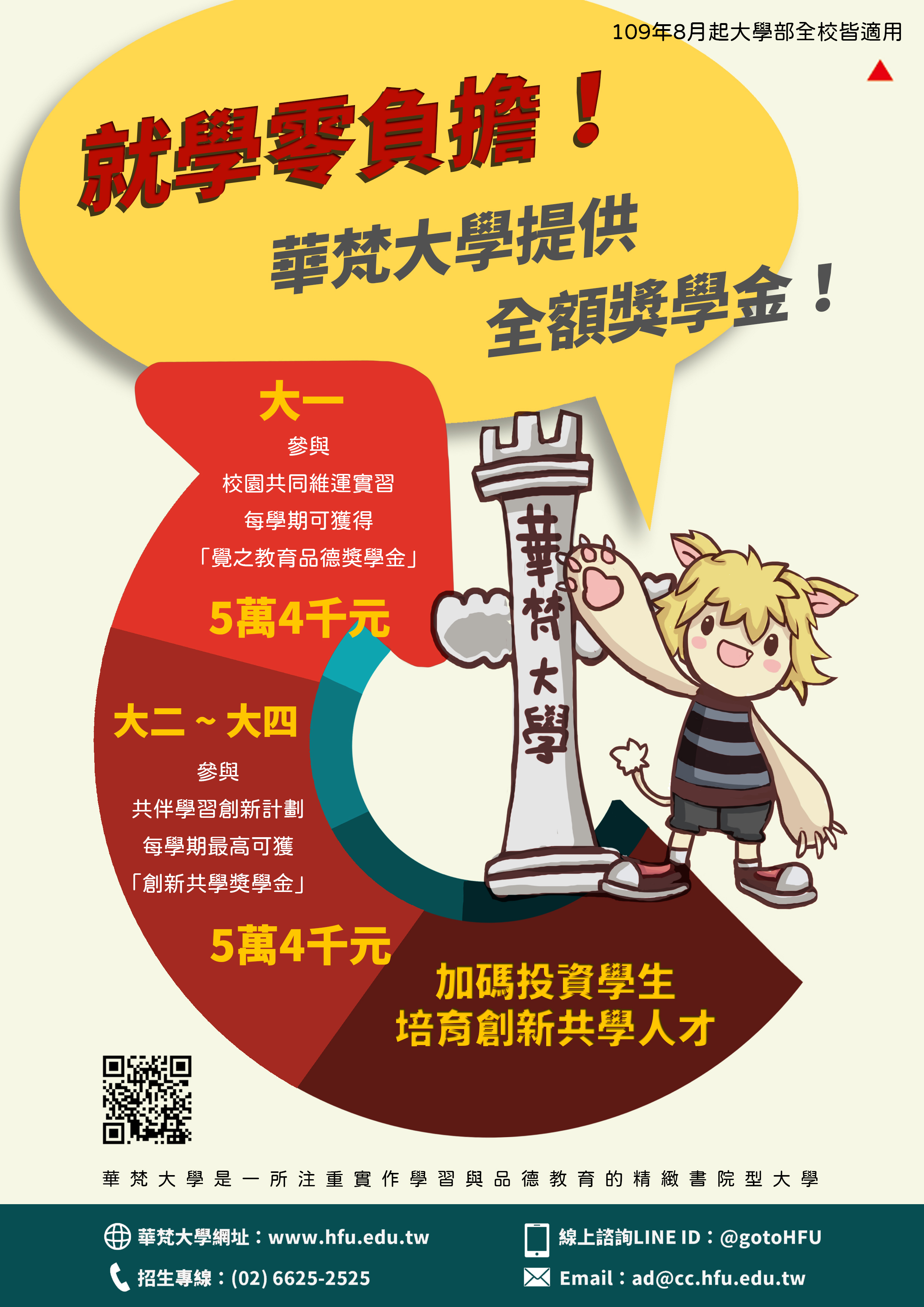 四、為協助同學安心就學,華梵大學自109學年度起提供入學之新生等同全額學雜費之獎學金,詳細資訊揭露於華梵大學官網「華梵大學全額獎學金」。