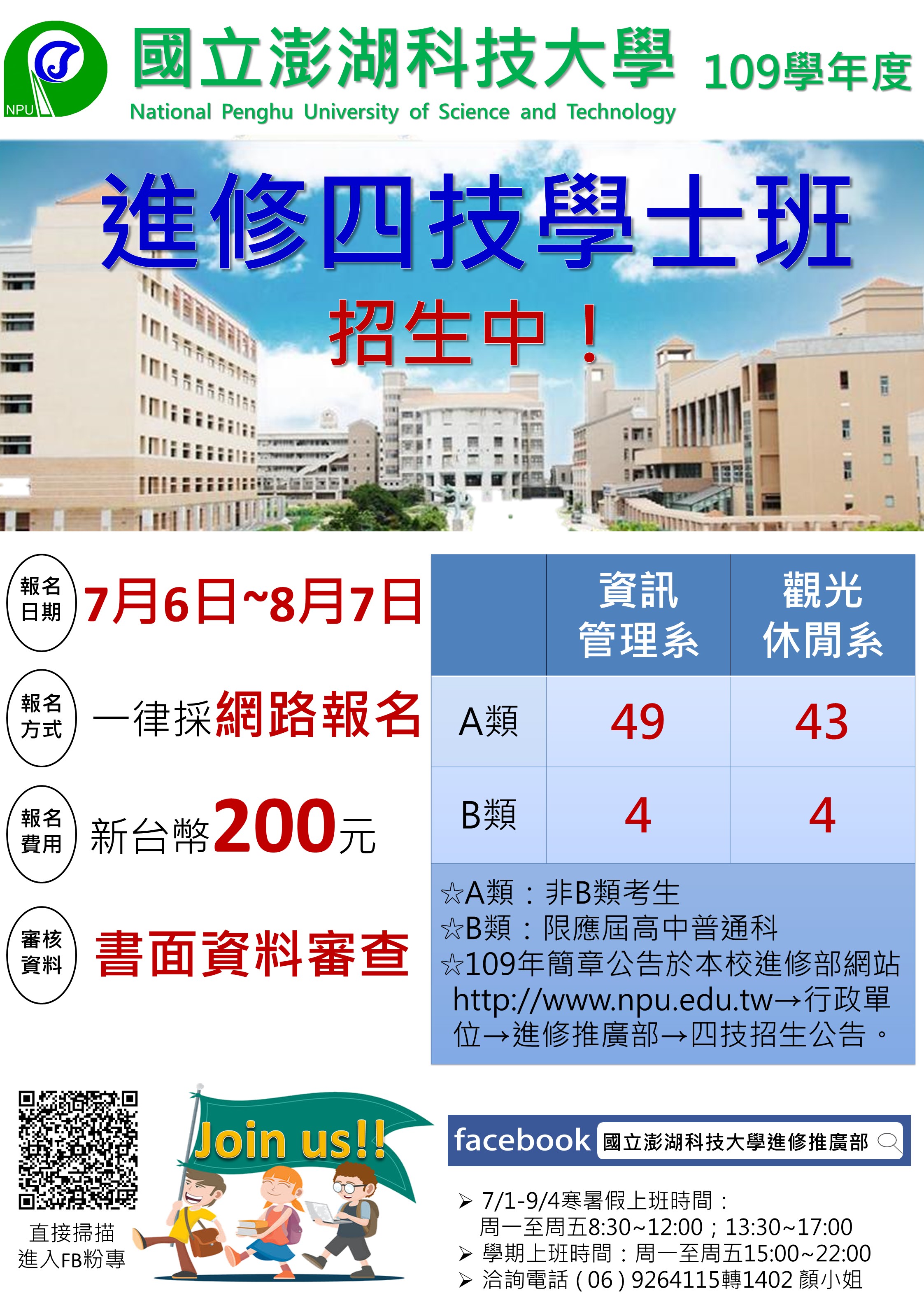 轉知國立澎湖科技大學109學年度進修推廣部四技單獨招生訊息