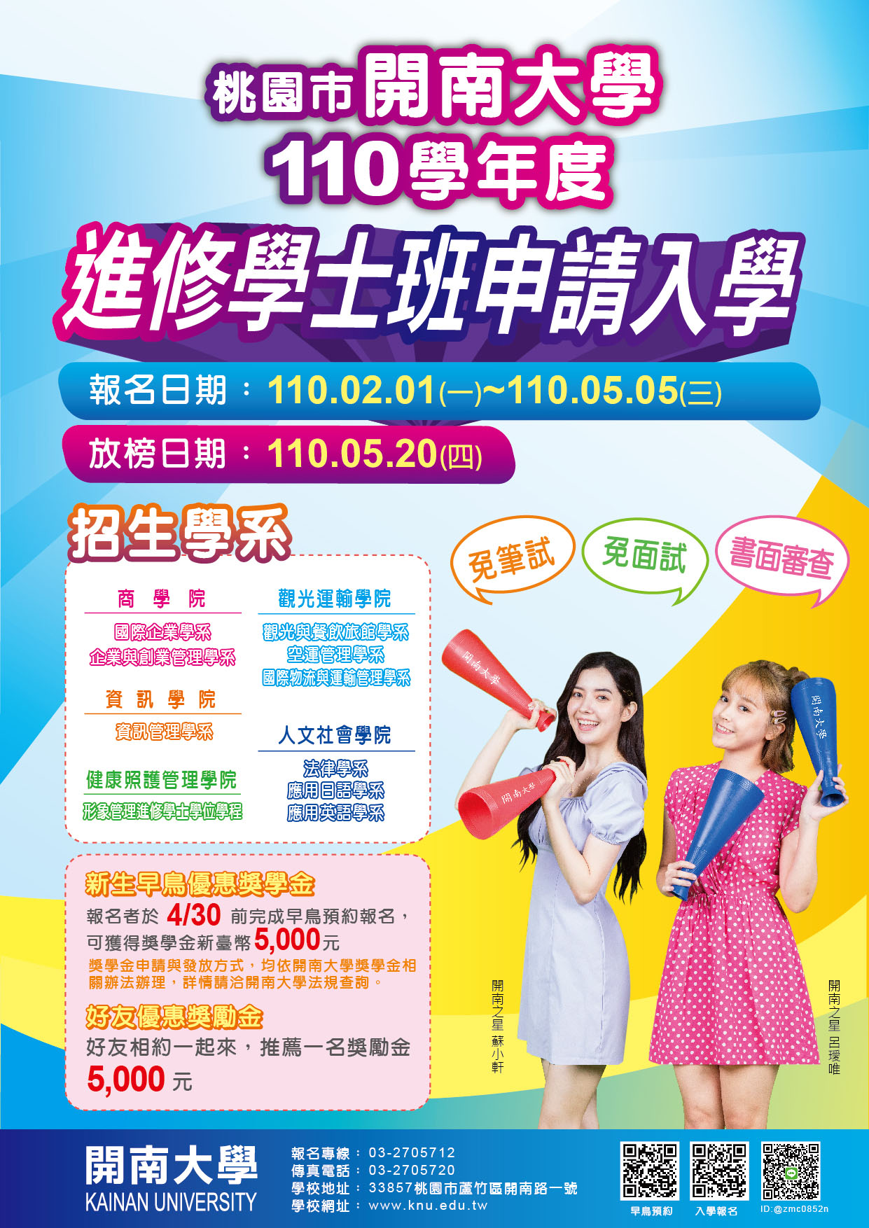 五、相關資訊均以開南大學招生網頁(https://recruit.knu.edu.tw/)為準。