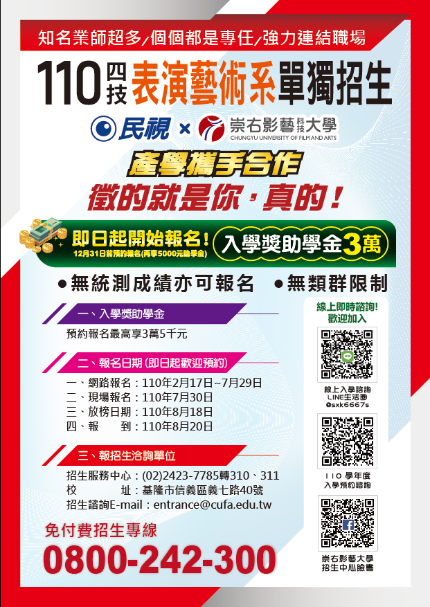 五、招生諮詢請洽崇右影藝科技大學招生服務中心,免付費服務專線:0800-242-300;LINE Q:@sxk6667s。