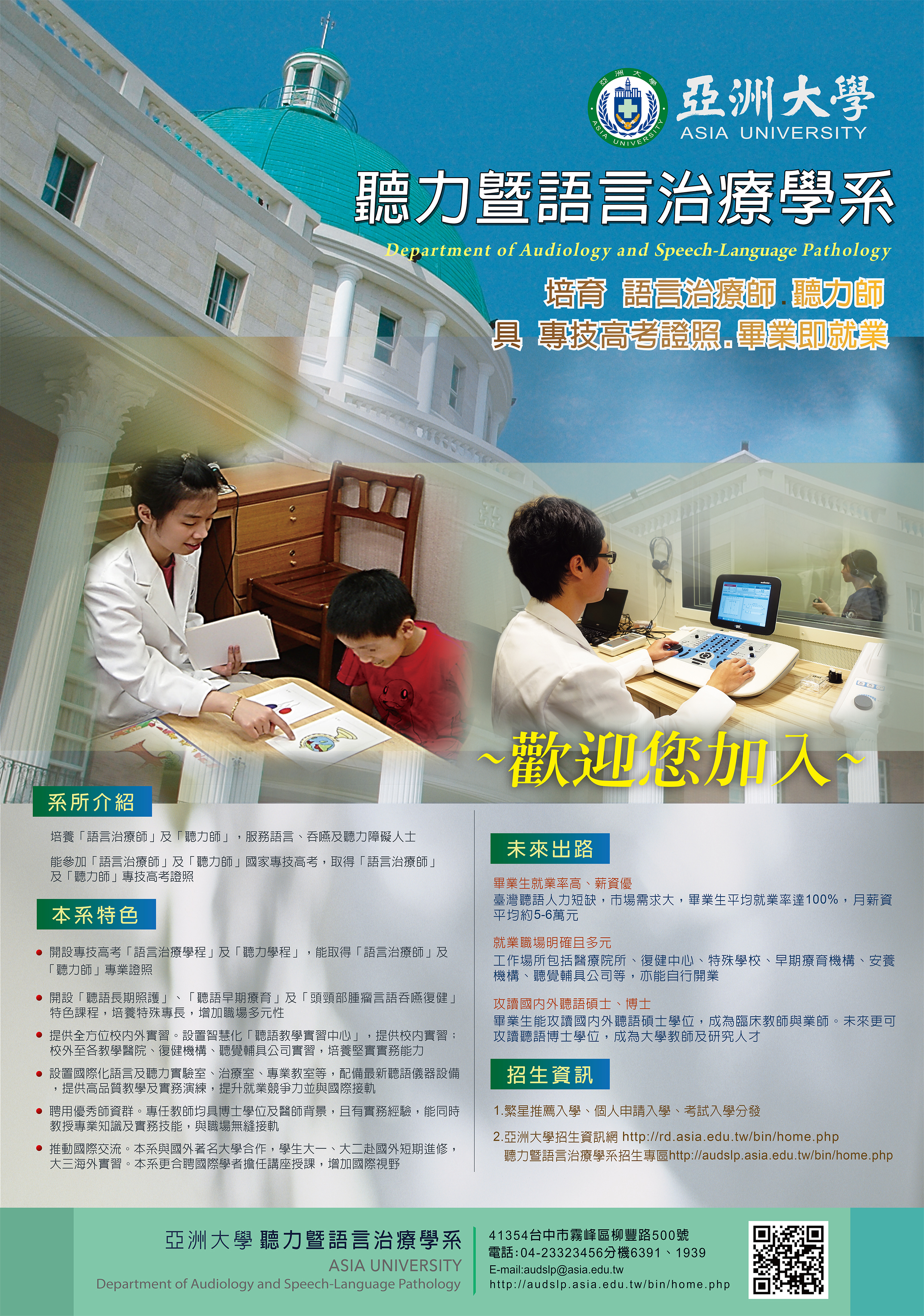 一、亞洲大學聽力暨語言治療學系學士班培養「語言治療師」及「聽力師」,取得國家專技高考證照,畢業立即就業。