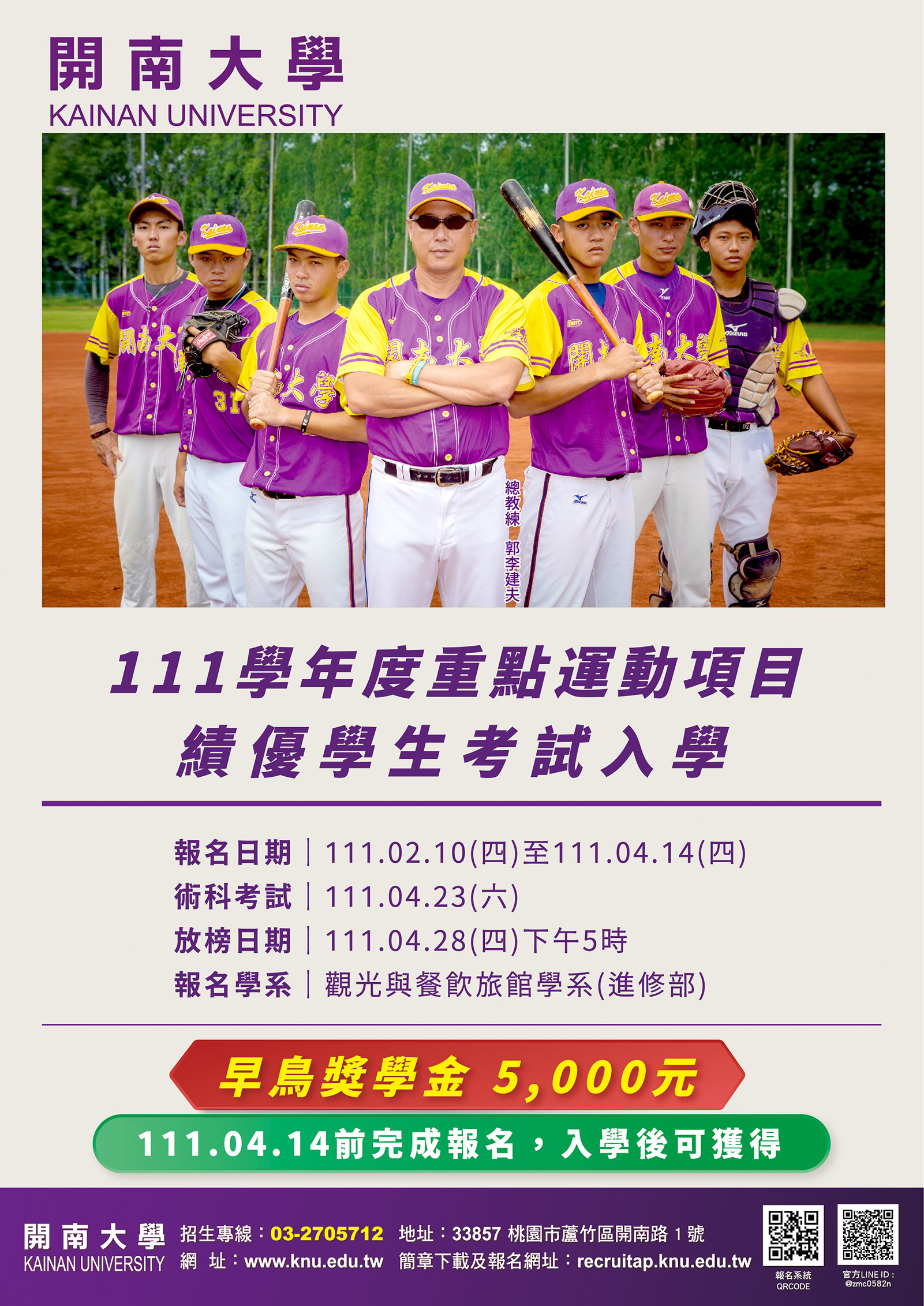 轉知開南大學111學年度重點運動項目績優學生考試入學訊息