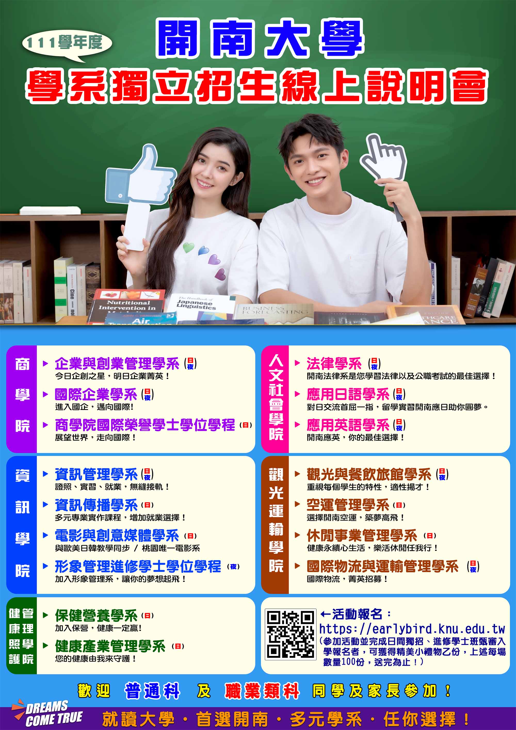 一、為增進考生與家長對於升學資訊之理解,開南大學於111年07月23日(星期六)、111年08月06日(星期六)上午11時至12時,舉辦「111學年度學系獨立招生線上說明會」。
