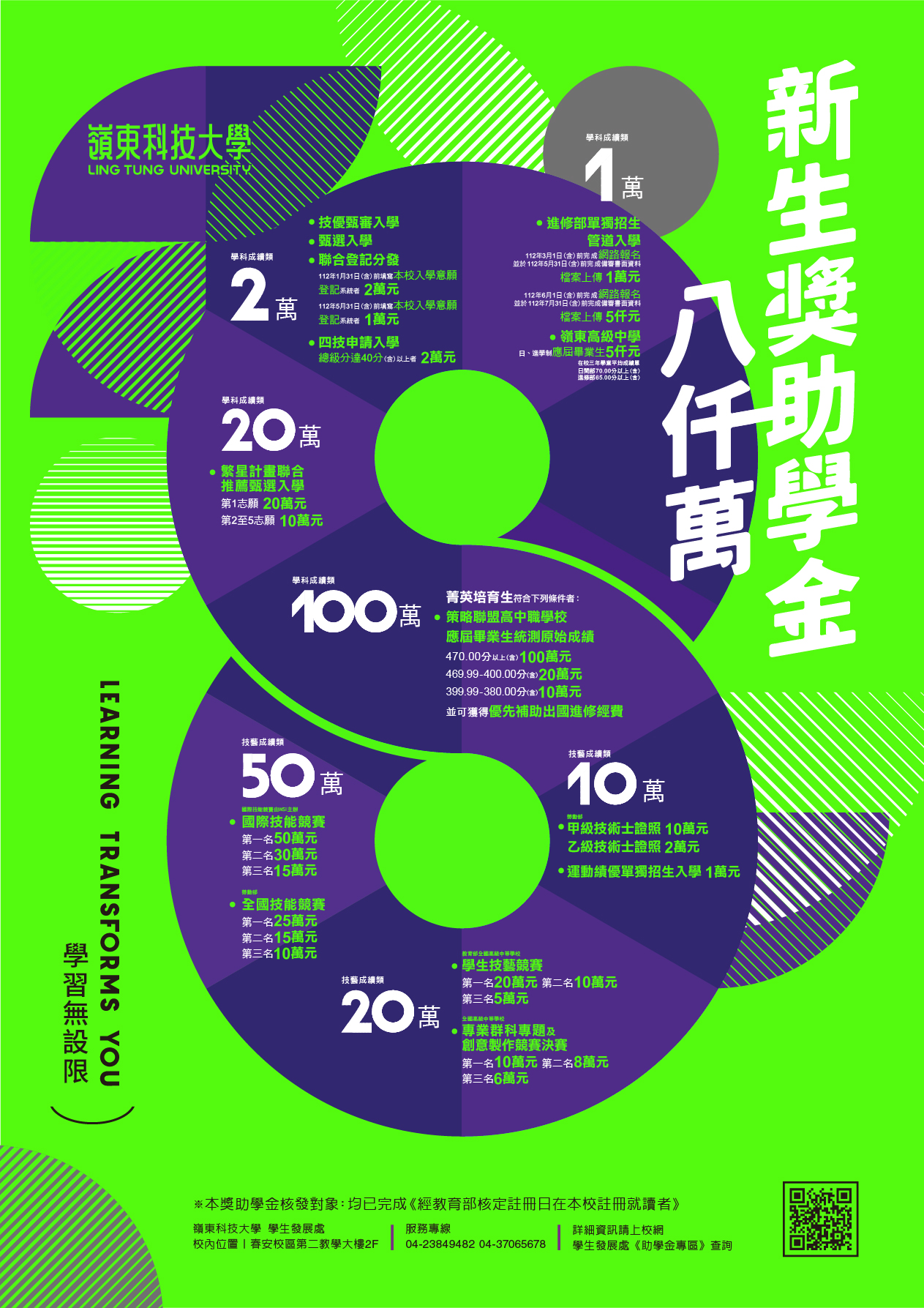 一、嶺東科技大學112學年度特提供新生入學成績優異助學金方案計新台幣捌仟萬元,如附件。