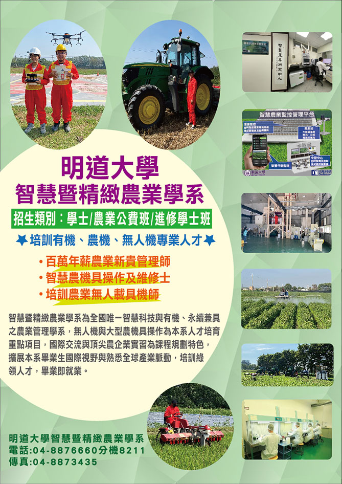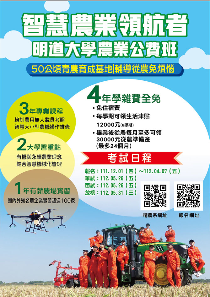轉知明道大學112學年度智慧暨精緻農業學系農業公費班招生資訊