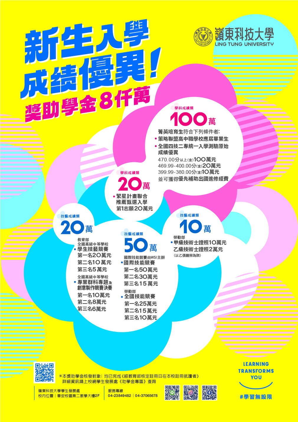 一、嶺東科技大學113學年度特提供新生入學成績優異助學金方案計新台幣捌仟萬元,敬請參閱附件。