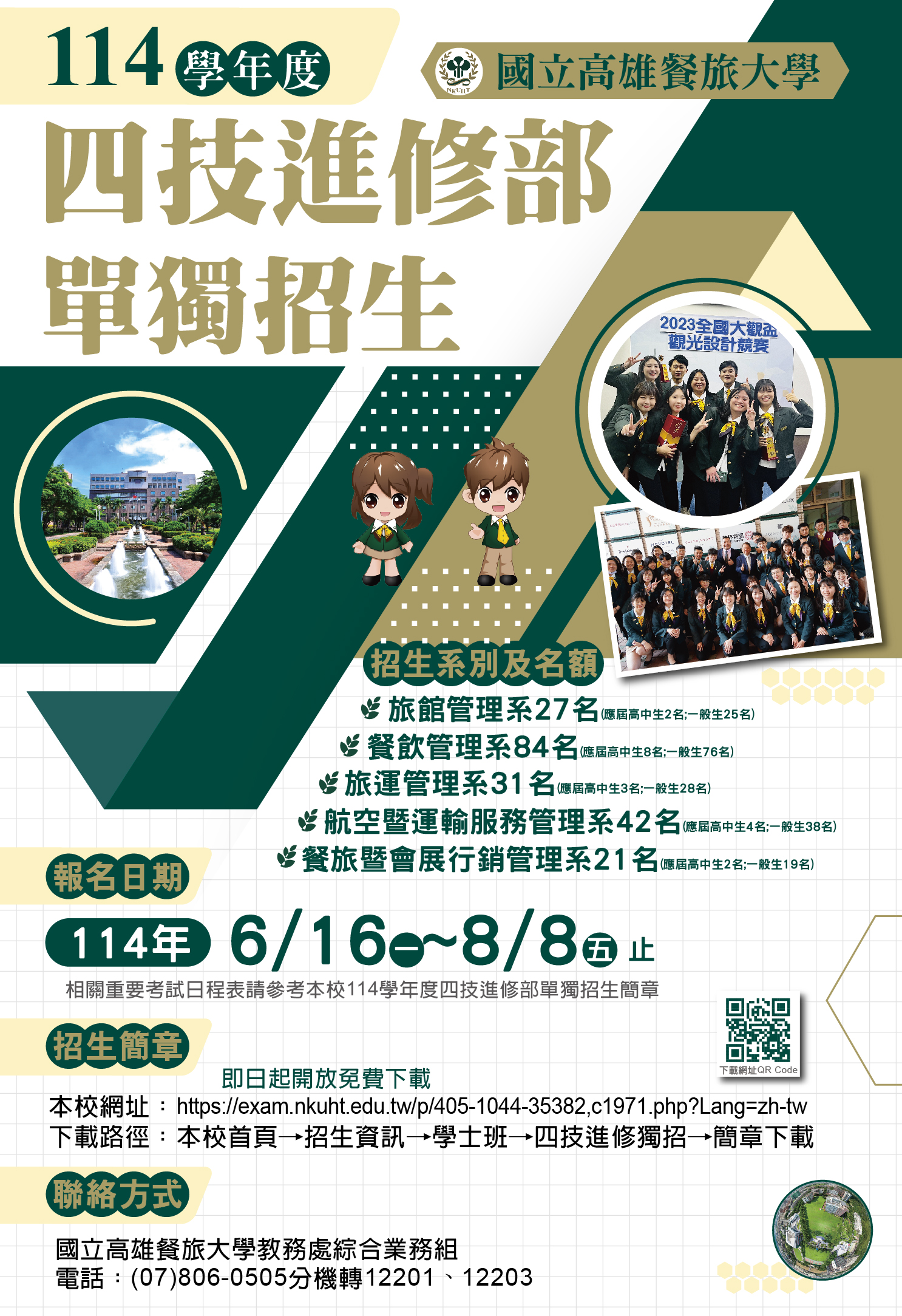 三、招生諮詢服務請洽國立高雄餐旅大學教務處綜合業務組:(07)806-0505分機12201、12203。