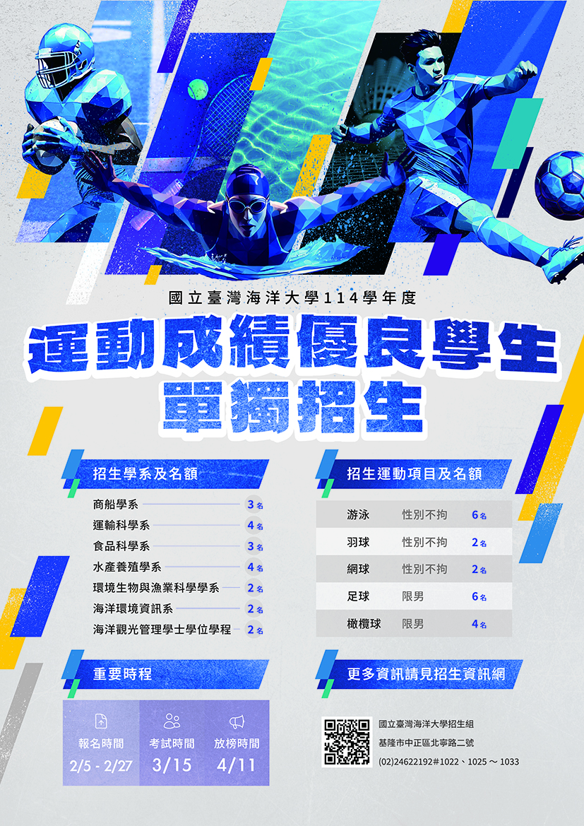 國立臺灣海洋大學「114學年度運動成績優良學生單獨招生」資訊