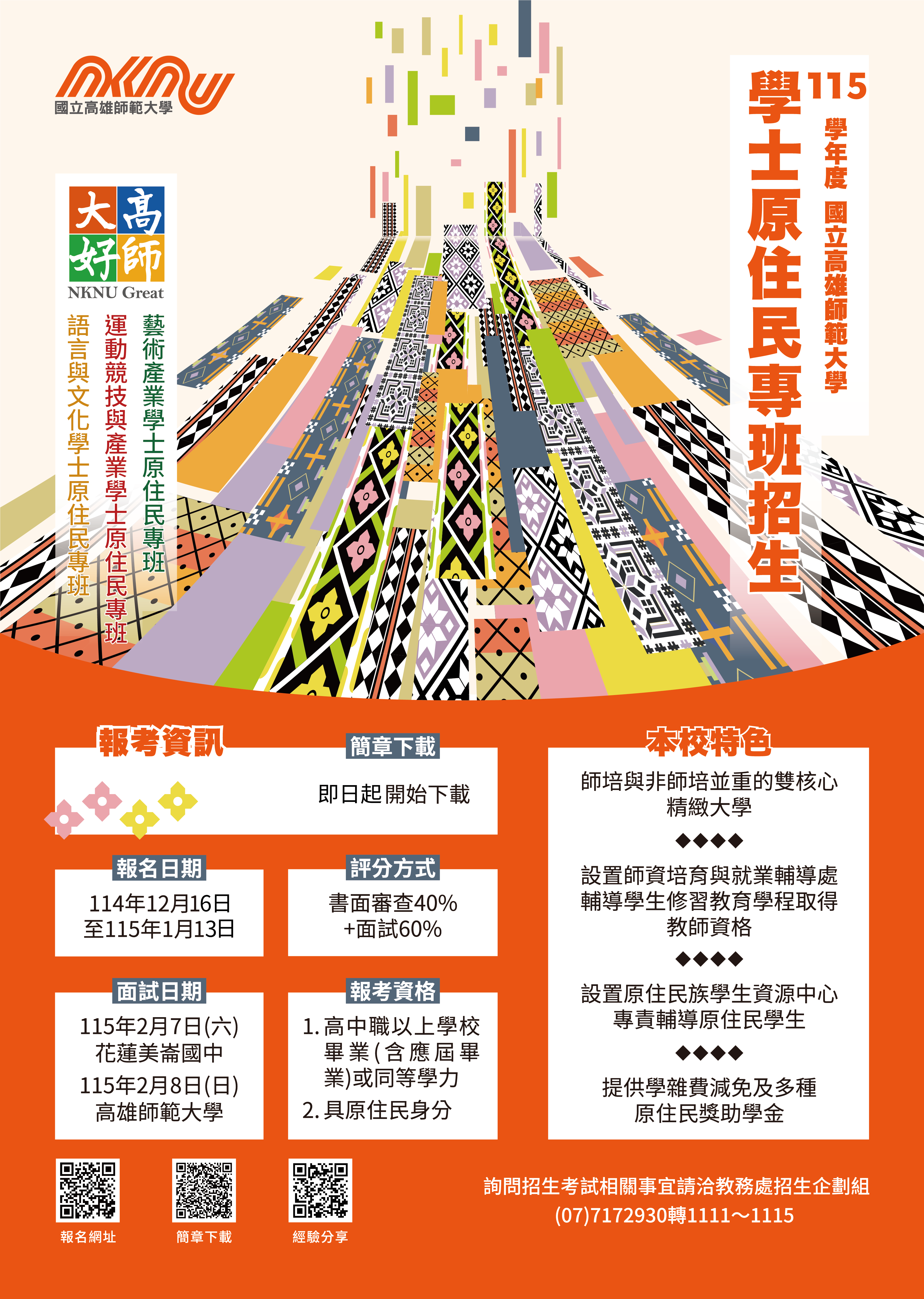 國立高雄師範大學115學年度學士原住民專班招生資訊