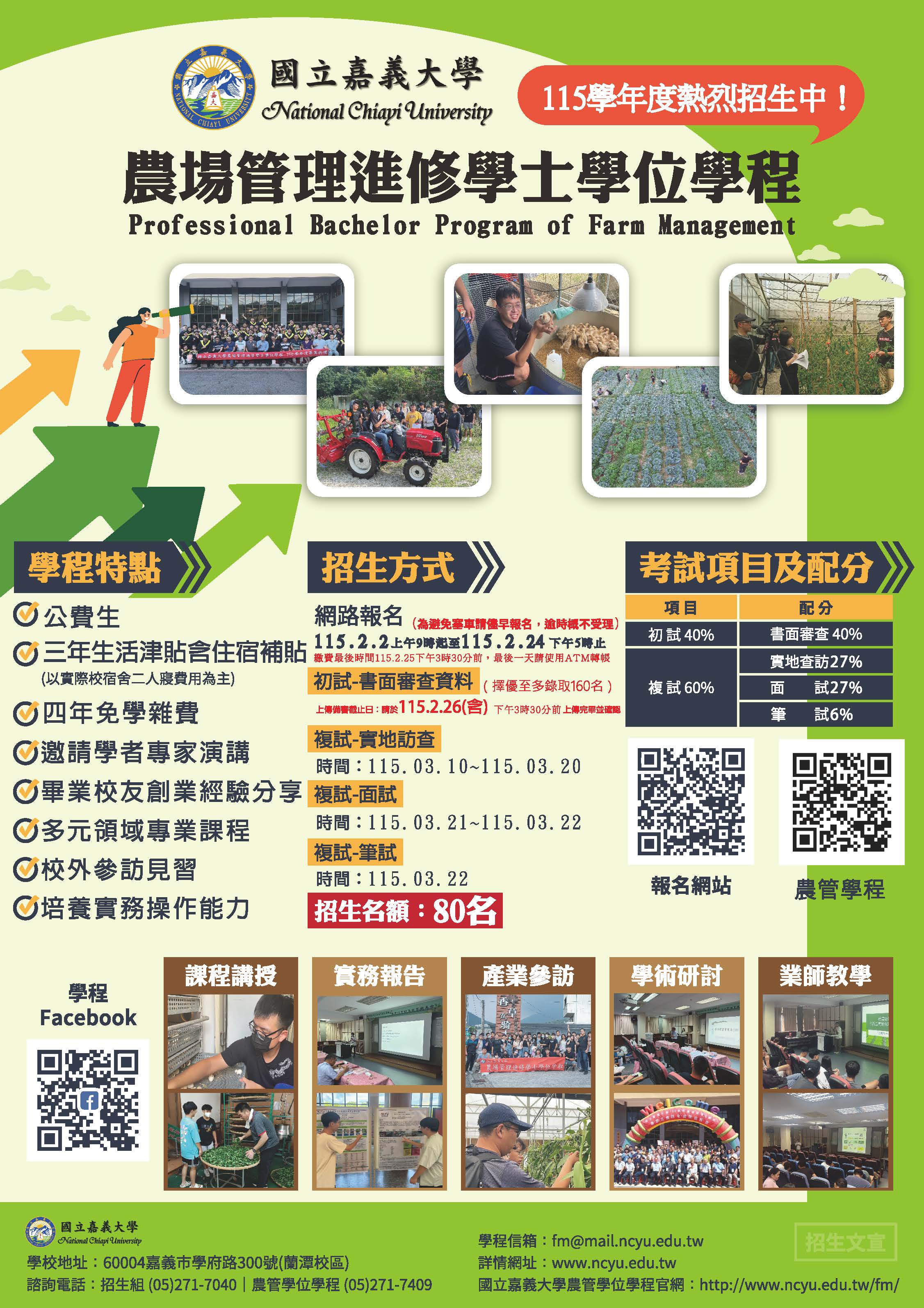 嘉義大學農場管理進修學士學位學程115學度農業公費專班招生資訊