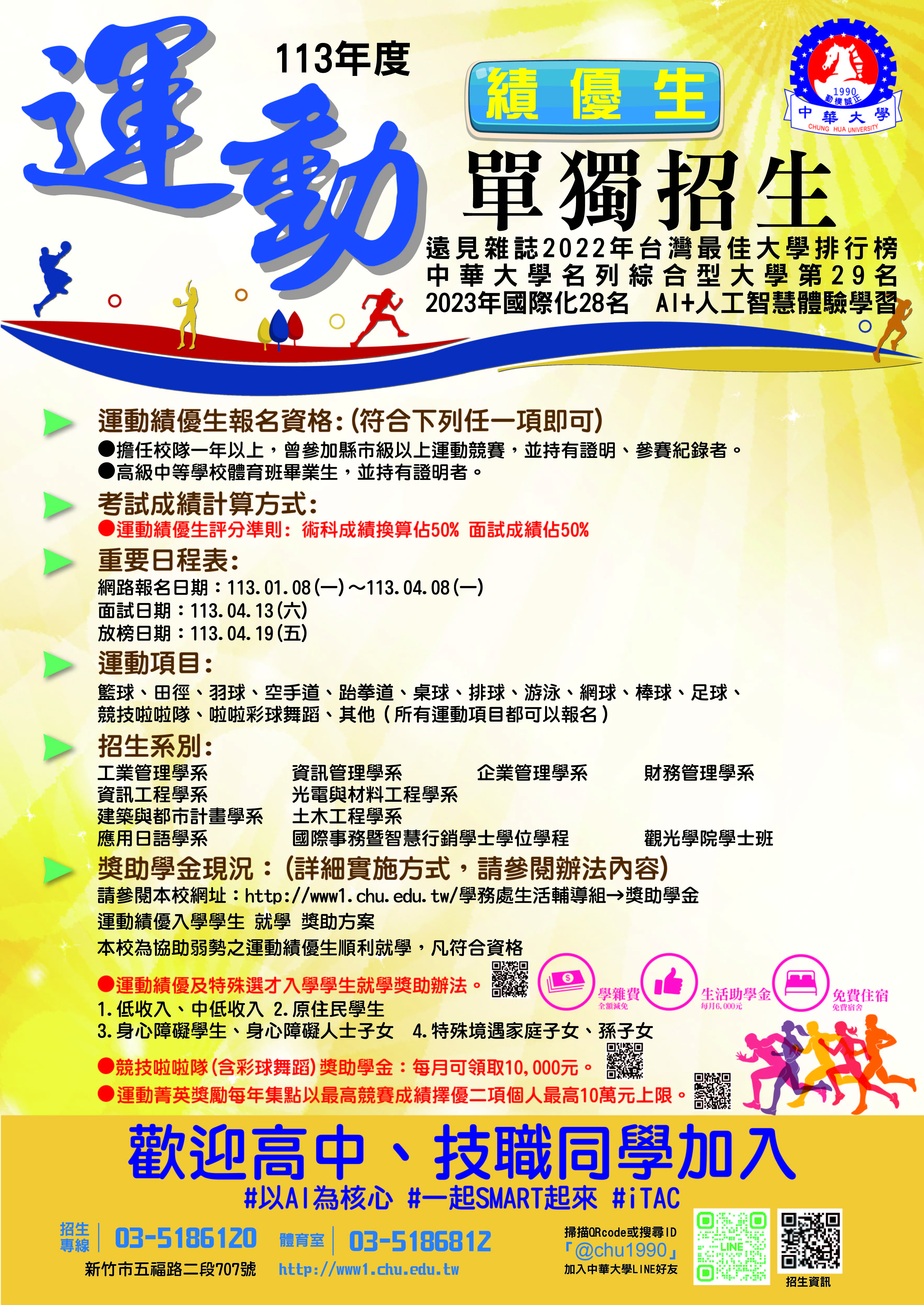一、中華大學「113學年度運動績優生單獨招生」日期: