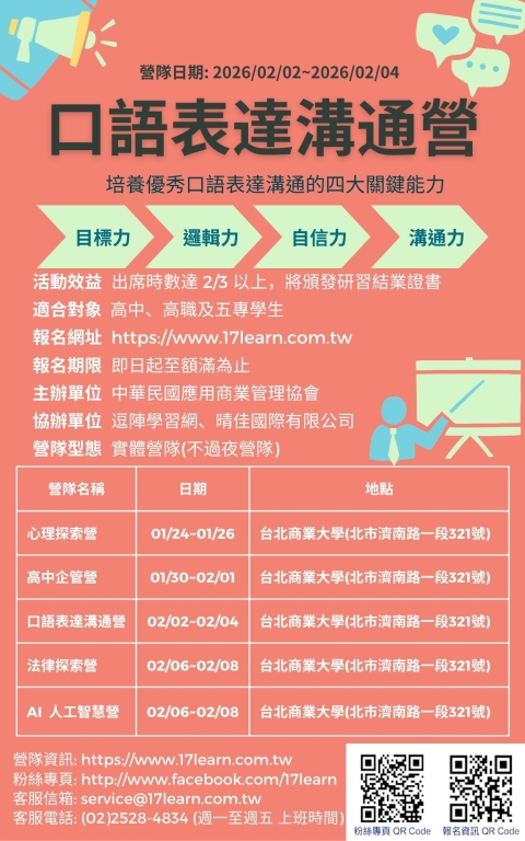 (三)口語表達溝通營:2026/2/2(週一)~2026/2/4(週三)。無論是升學口試或求職面談,口語表達已經是現代人不可 或缺的能力。「口語表達溝通營」透過講解、示範、訓練和不斷的演練,克服公開發言的恐懼,人人都可以成為口語表達的高手!