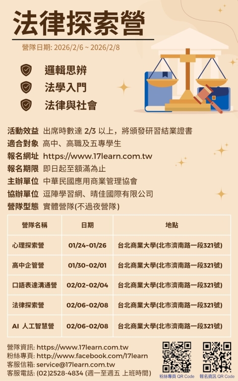 (四)法律探索營:2026/2/6(週五)~2026/2/8(週日)。許多人覺得法律高深難懂,但其實生活中處處離不開法 律,【法律探索營】將透過專業的法律課程、遊戲偵查推 理、模擬法庭等多元活動,拉近學生與「法」的距離!介紹基礎法學與生活應用。體驗式學習:經由法律辯論、模擬法庭的活動,有做中學,有效提 升學習成果。分組活動討論,透過團體遊戲與體驗探索活 動進行。