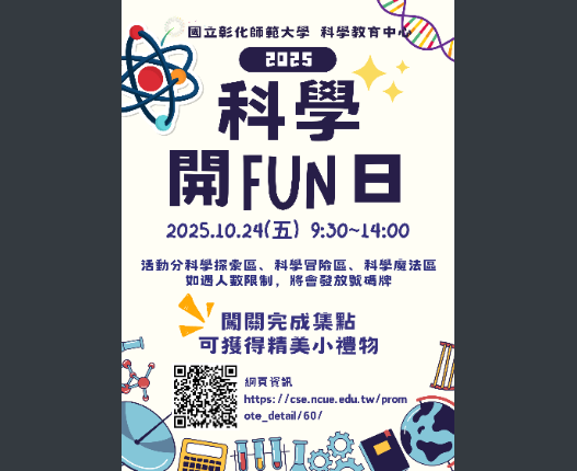 國立彰化師範大學校慶將舉辦「2025年科學開Fun日活動」,開放本校理學院教師研究室提供參觀體驗,並同時辦理科趣攤位闖關活動