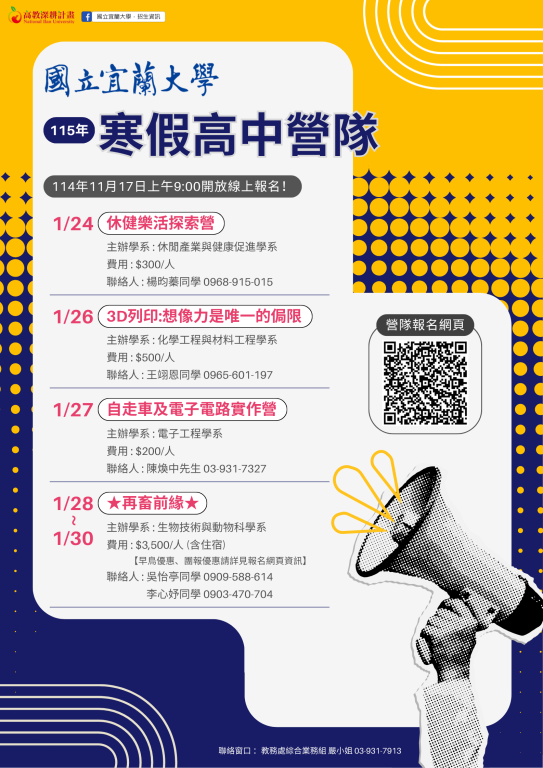【寒假營隊】國立宜蘭大學特於115年寒假期間辦理高中主題營隊活動