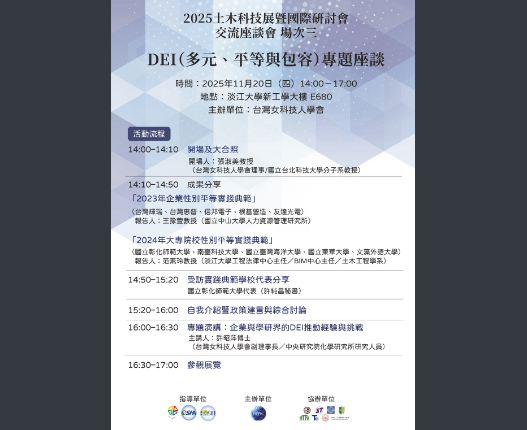 一、旨揭論壇係該中心舉辦之「土木科技展暨國際研討會」場次3活動,該座談會由台灣女科技人學會主辦,活動聚焦多元、平等與包容(DEI)之企業實務、大專校院推動成果、跨領域交流及展覽導覽。