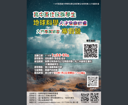 國立臺灣師範大學地球科學系及科學教育中心辦理教育部國民及學前教育署委辦之「115年度高級中等學校原住民族學生地球科學人才培訓計畫」將於115年1月26日至1月30日辦理第一梯次入門推廣研習(暑假營),請轉知貴校地球科學授課教師、原民族學生相關輔導教師、原民專班/社團指導老師協助推薦有興趣之原住民族學生報名及轉知原住民學生踴躍參加。