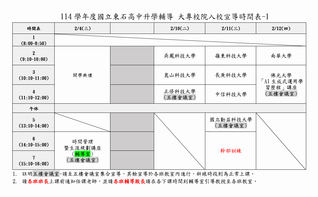 1.註明五樓會議室-請至五樓會議室集合宣導,其餘宣導於各班教室內進行,斜線時段則為正常上課。