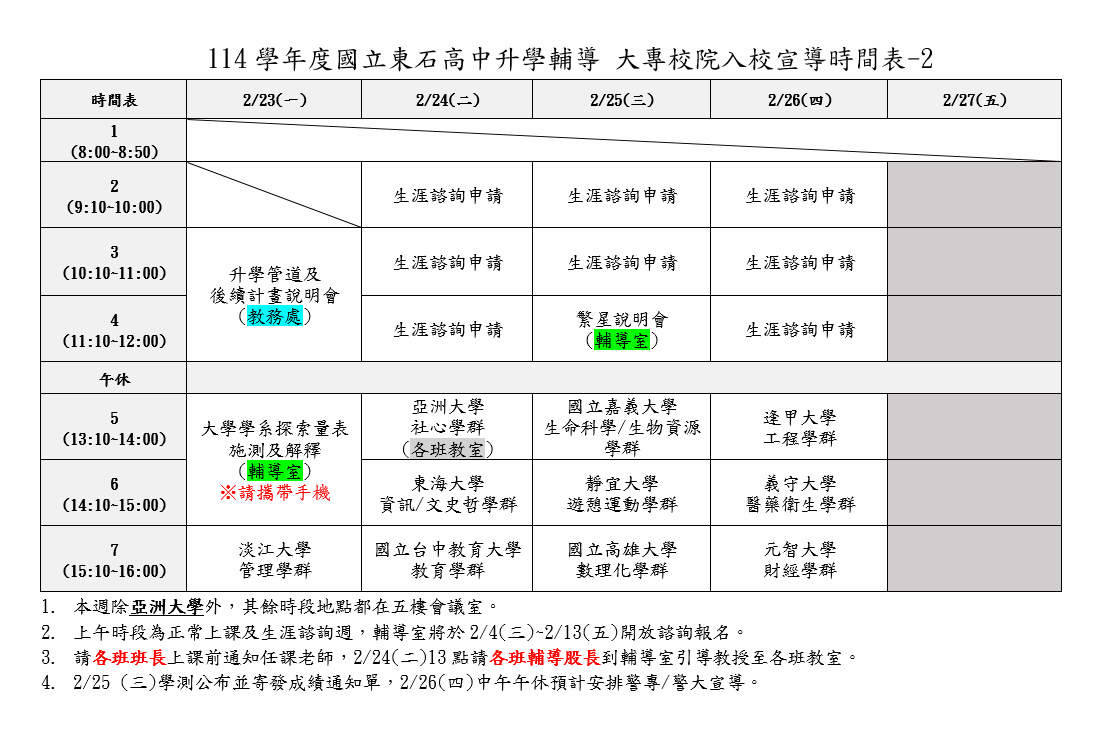 下面為普三從2/4(三)起到2/12(四)、2/23(一)到2/26(四)輔導室安排的「大專校院入校宣導時間表」
