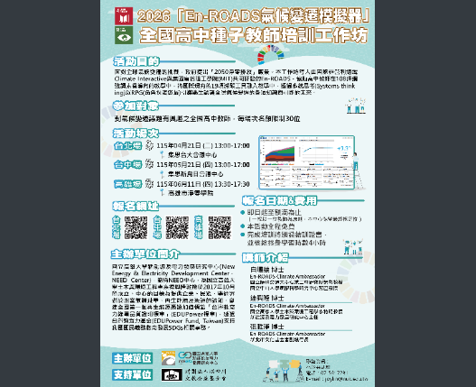 一、本校新能源及電力發展研究中心(以下簡稱本中心)預計於本年度辦理3場次2026「En-ROADS氣候變遷模擬器」全國高中種子教師培訓工作坊,各場次時間地點如下: