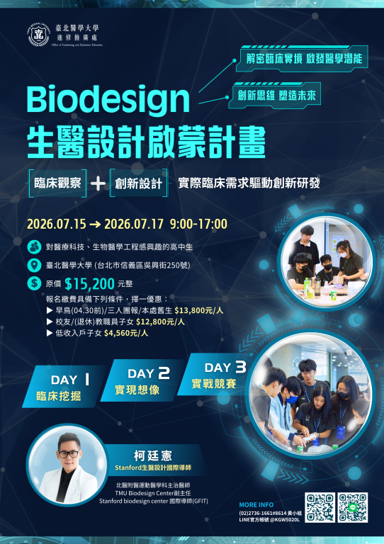 (四)Biodesign生醫設計–建立學員對 Biodesign 醫材開發 之基礎認知與學習興趣,透過系統化引導,帶領學員實際體驗從「需求識別」到「解決方案設計」的完整歷 程,進而培養其設計思維與問題解決能力。