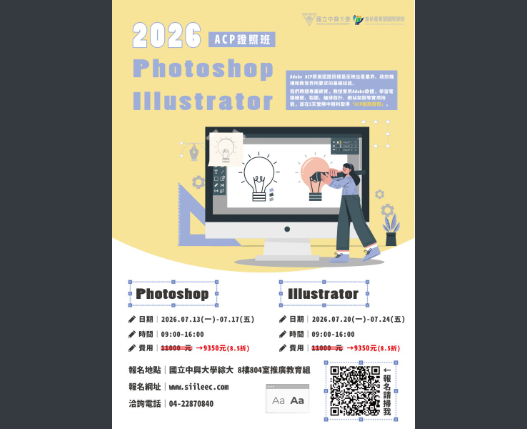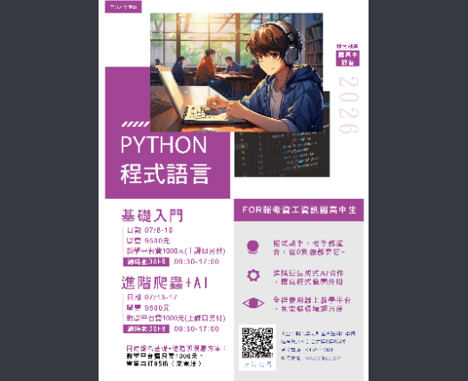 三、本校同步推出多項暑期熱門課程與證照輔導,包括「Python程式系列」、「人工智慧工程素養認證輔導」、「ACP國際證照-Photoshop與Illustrator考照班」、「SSE色彩學證照輔導」及「CCS生成式AI基礎能力認證班」等,內容結合理論與實作,適合國高中生探索興趣並強化專業能力。