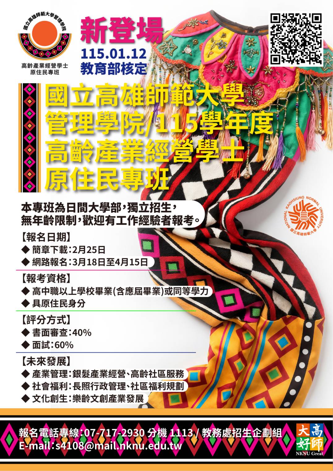 【升學資訊】國立高雄師範大學115學年度「高齡產業經營學士原住民專班」招生資訊