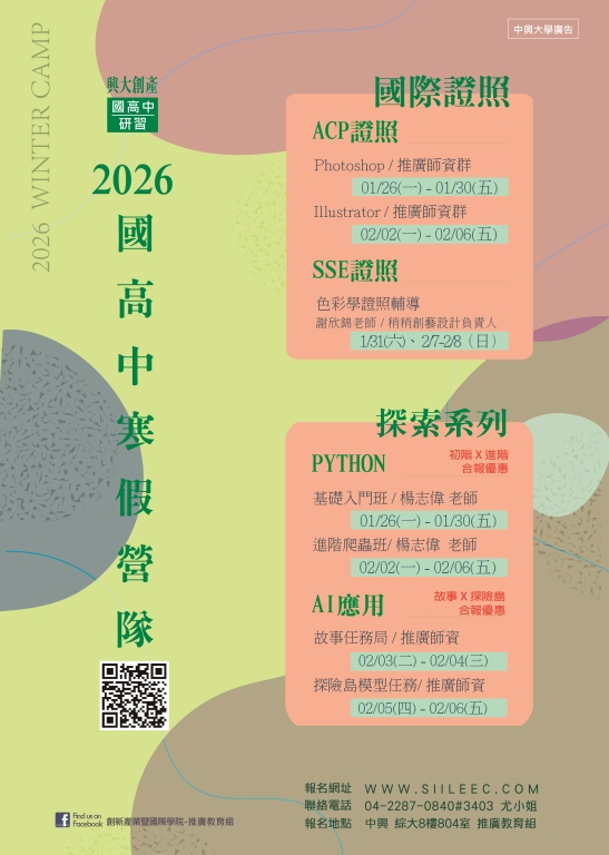 四、聯絡窗口:本校創新產業暨國際學院推廣教育組,電話 (04)22870840,詳情請參簡章與海報。