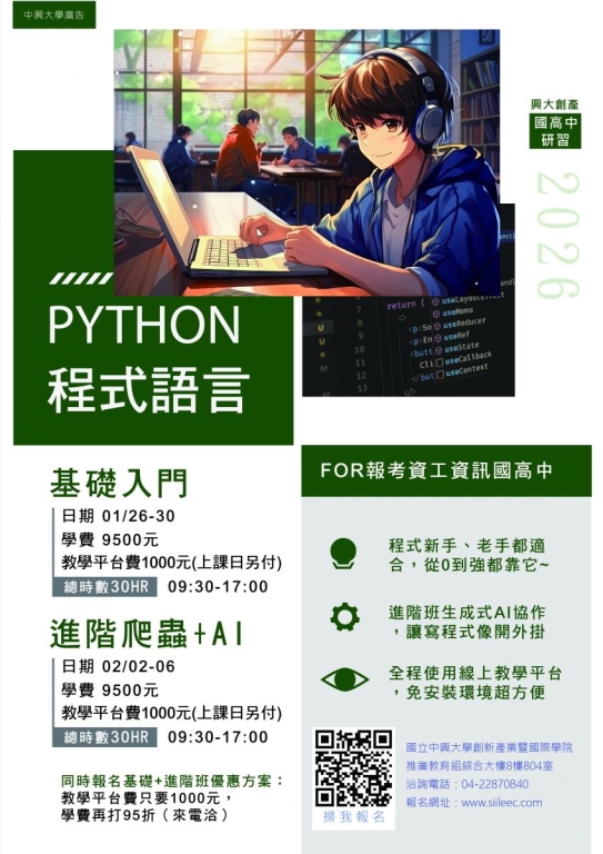(一)《Python程式設計系列基礎入門/進階爬蟲班》,想靠程 式加身以APCS加分報考資工系所,還有超熱門的 生成 式 AI 協作技巧,從0到強都靠它!讓這堂課成為你的黃金跳板!