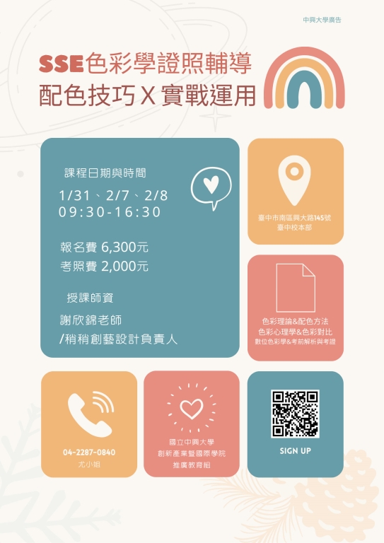 (三)針對想增進色彩學配色養成,提供《色彩學國際SSE證照 輔導》,為您申請國內外單位備審加分。