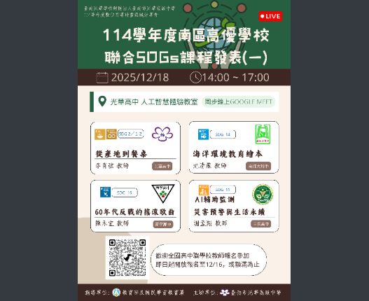 臺南光華學校財團法人臺南市光華高級中學檢送114學年度第一學期「南區高優學校聯合SDGs課程分享會」實施計畫及海報