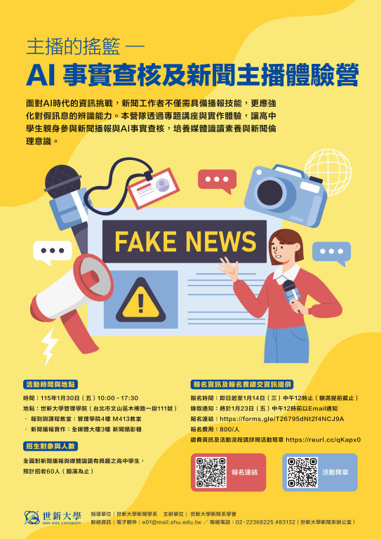 一、為提升高中學生對媒體識讀與假新聞辨識之能力,本系系 學會特辦理「主播的搖籃—AI事實查核及新聞主播體驗 營」,邀請對新聞傳播、媒體識讀或AI應用有興趣之學生參與。