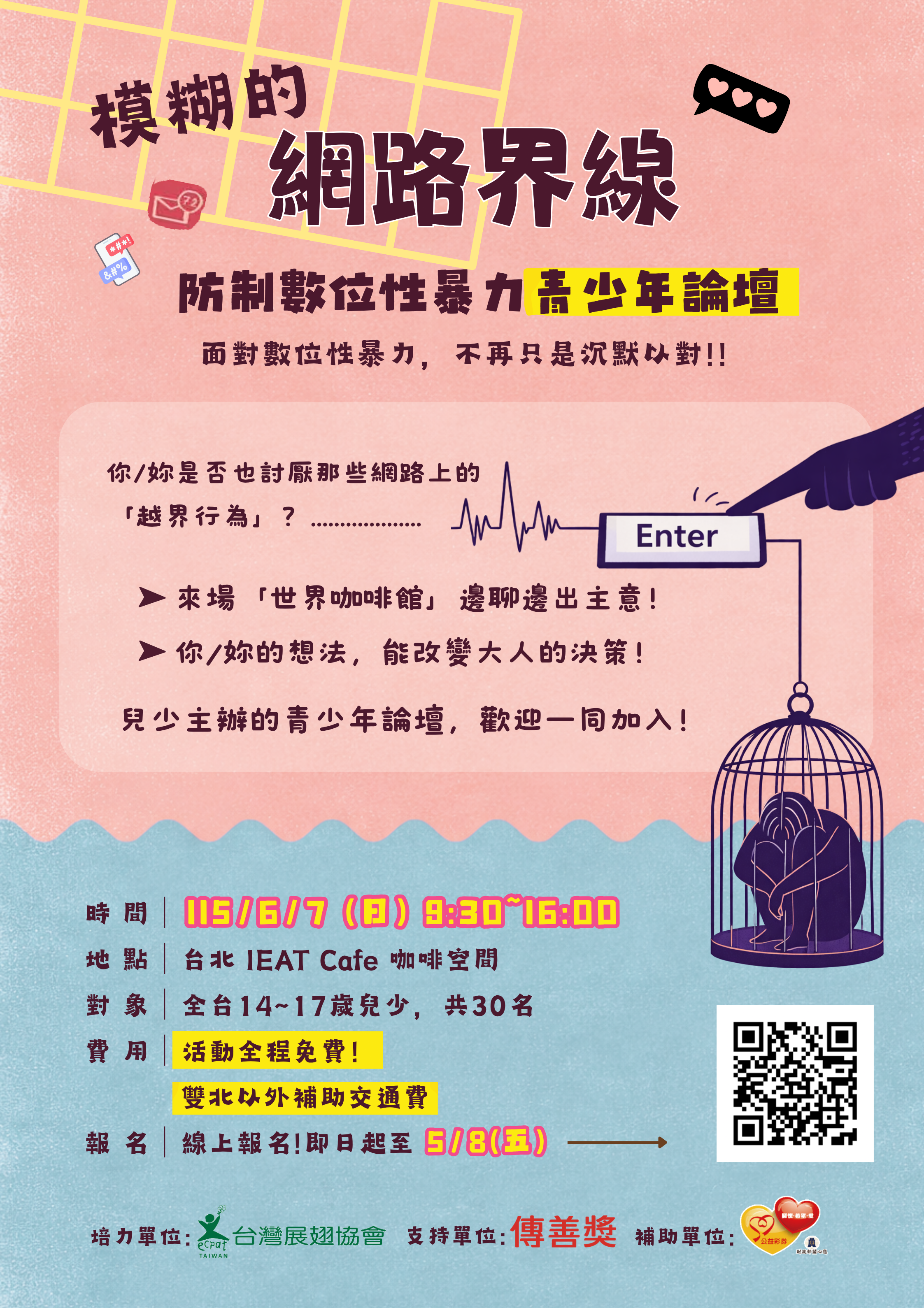 一、為提升兒少對「數位性暴力」議題之認識,以及促進兒少表達與參與,由台灣展翅協會培力之兒少團隊將於2026年6月7日(日)舉辦「模糊的網路界線:防制數位性暴力青少年論壇」,以「數位性暴力」為討論主軸,探討在數位環境中的互動與界線,廣邀全台兒少從自身經驗出發進行交流與討論。